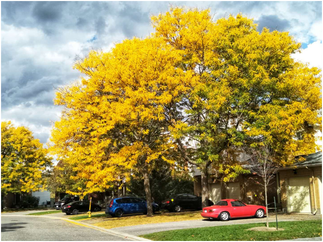 拐过一个小弯,眼前的画风突然变了。一户户人家门前的草坪上,一棵棵大小不一的槐树,长满了或斑驳或明亮或厚重的黄叶,树下青青的草坪上,散落的不再是枫叶的火红,而是槐叶的暖黄。这槐黄,是秋日里这段街区的主题色调,这槐黄的美艳,像一杯陈年的老酒,醇香扑鼻,沁人心扉,令人心醉。